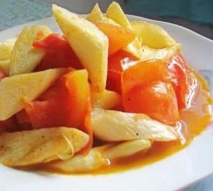 然后放入番茄瓣和炸过的茭白,加盖用小火焖烧至汤汁浓稠,用味精调味即可。