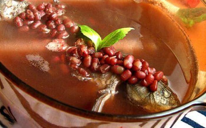 鲤鱼味甘、性平,具有滋补健胃、利水消肿、通乳、清热解毒、止号嗽下气之功效,对各种水肿、浮肿、腹胀、少尿、黄疸、乳汁不通皆有益。平时鲤鱼多红烧,鲤鱼红豆汤是专为治疗水肿之用,平时较为少见。红豆含有较多的皂角甙,可刺激肠道,因此它有良好的利尿作用,能解酒、解毒,对心脏病和肾病、水肿有益。