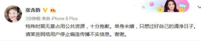 但没想到在12日早上,张含韵在社交媒体上发布消息表示自己是单身,在这个特殊时期占用了大家的公共资源实在不好意思,给大家的猜测做出了回应,表明自己并未结婚,也没恋爱。