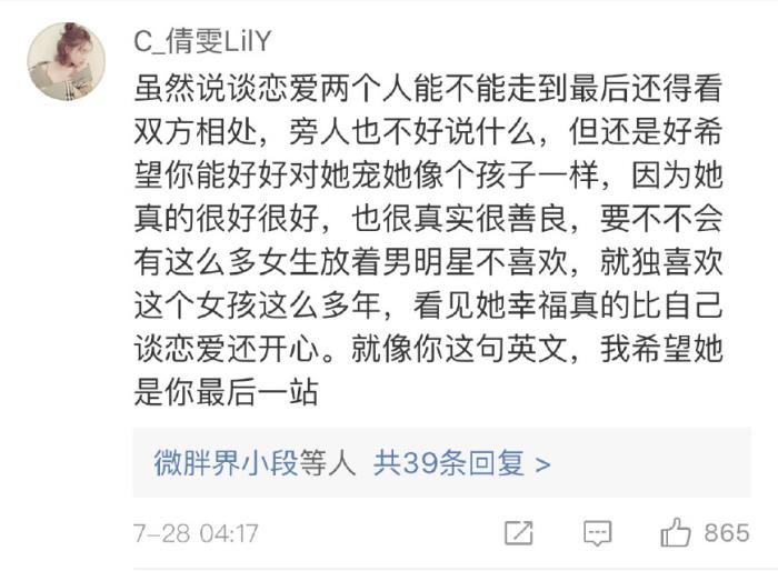 7月27日晚些时候,新男友的微博账号被曝光,名叫綦谷karma想要多头发,凌晨两点钟左右,新男友还发了一段话疑似向郑爽深情表白“Bubble... I hope you are my one last station. And, I hope the hope is not just a wish”,翻译过来就是“我希望你是我的最后一站,我希望这不仅仅是一个愿望”,又宠又甜,爽妹这次是遇到命中注定的真爱了吗?粉丝也纷纷留言祝福二人,并嘱托张恒好好照顾郑爽。