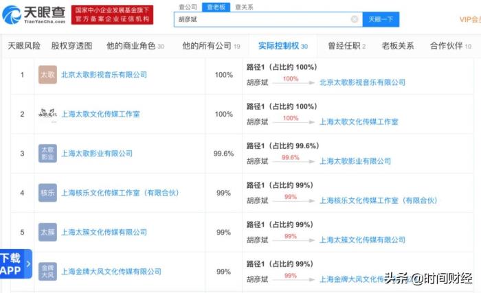 胡彦斌实际控制30家公司,其中一极文化传播(北京)有限公司、上海风风火火文化传播有限公司、上海梓韵实业有限公司均已注销。