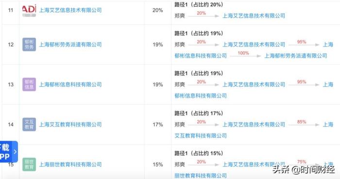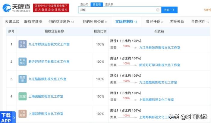 时间财经查阅天眼查发现,郑爽实际控制15家公司,其中,新沂熊大熊二影视文化工作室、新沂好好学习影视文化工作室、上海跳耀影视文化工作室、上海郑爽影视文化工作室4家公司已经注销。