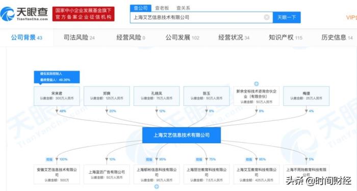资料显示,上海艾艺注册资本625万人民币,2006年4月成立。经营范围为:计算机软硬件技术开发、技术咨询、技术转让、技术服务,设计、制作各类广告,企业形象策划,景观设计,电子产品、工艺美术品、文具用品销售,计算机系统服务。宋来君占股48%为第一大股东,郑爽占股20%为第二大股东。