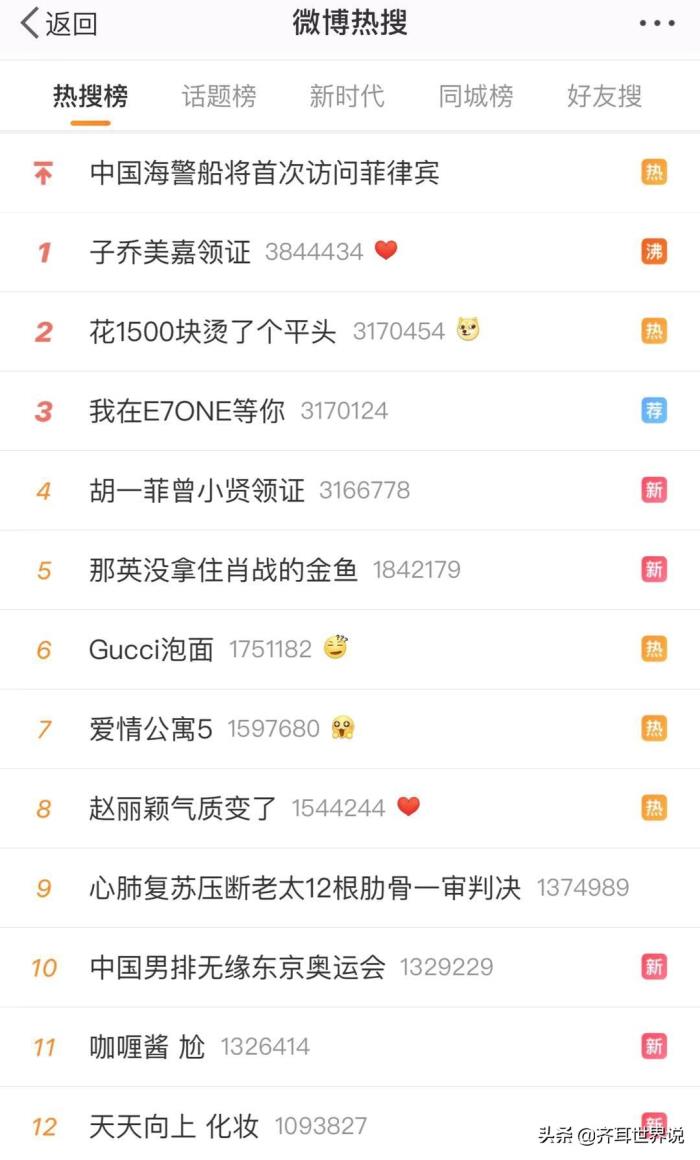 爱5开播后,子乔美嘉领证冲到热搜第一,热搜前十进了三个。