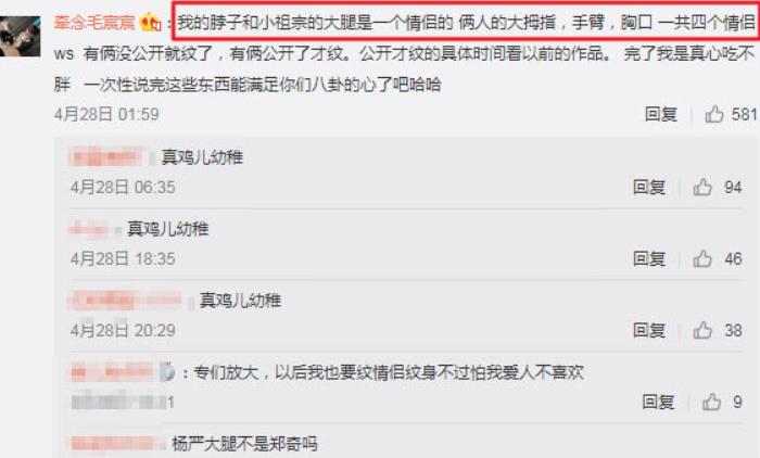 其实杨清柠之前和郑诺奇在一起的时候,也把他的名起的名字纹在了自己的腿上,而且还特别的显眼,就在左腿的位置。这一次毛宸宸又说杨清柠也把他的名字纹在了自己的大腿上,那么肯定就是纹在右腿了。网友看了之后也是纷纷嘲讽说,都是真爱!
