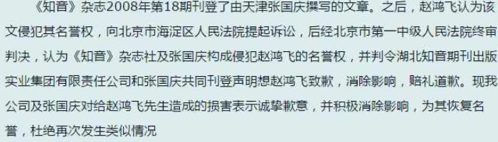 2012年,《知音》在2月月末版面第56页中,发布了对赵鸿飞先生的致歉声明。