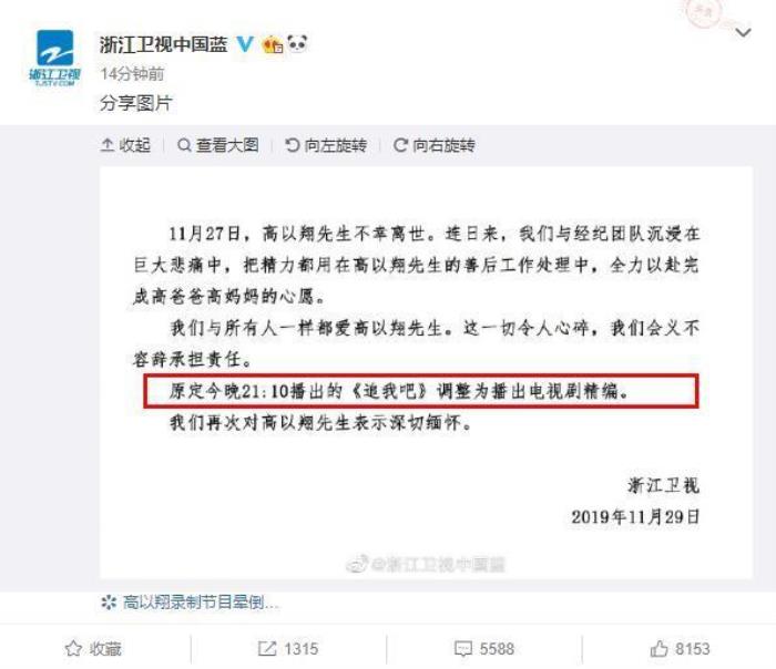 11月27日,高以翔在录制浙江卫视综艺节目《追我吧》倒地昏迷,最终离世。而11月29日,浙江卫视官媒也是发布声明,称精力全都用在了高以翔的善后工作处理中,称原定于11月 29日晚21点播出的《追我吧》停播,改为播放电视剧精编。