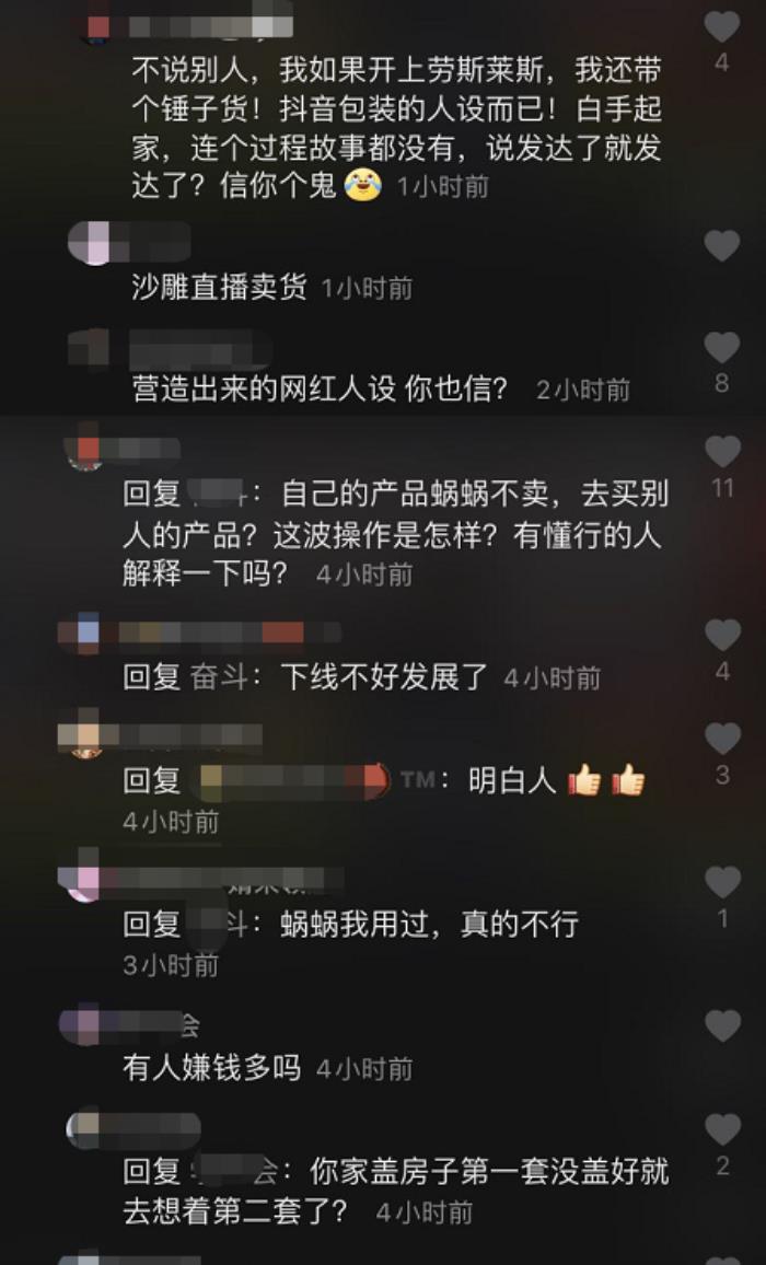 “不说别人,我如果开上劳斯莱斯,我还带个锤子货!抖音包装的人设而已!”、“营造出来的网红人设 你也信”、