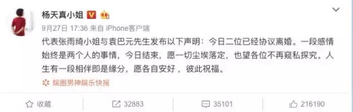 紧接着,昨天下午,张雨绮的经纪人发布声明,证实张雨绮和丈夫袁巴元已经协议离婚。