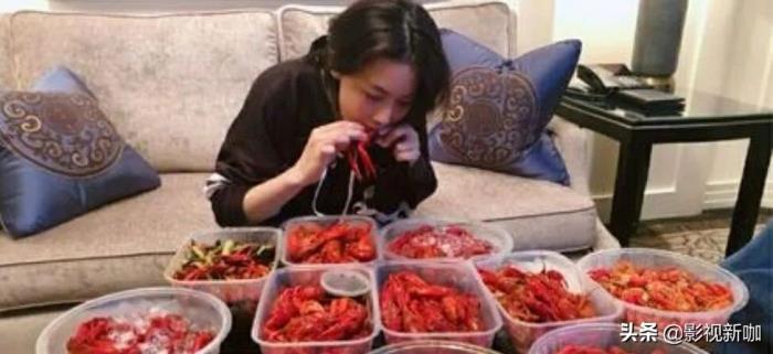 照片中,她身穿黑色外套,眼前摆着一大桌的小龙虾,色泽诱人,“酒酿冰镇小龙虾,太好吃了太好吃了!”