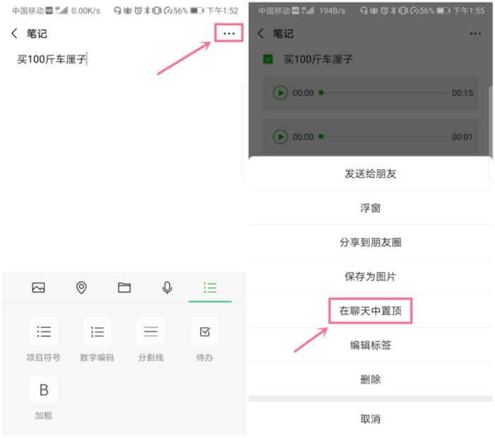 接下来就是微信的笔记功能啦,我们只要打开这个功能,就可以进行文字、语音和图片的添加,并且可以在聊天中置顶,避免出现遗忘的问题,可以说是非常好用了。