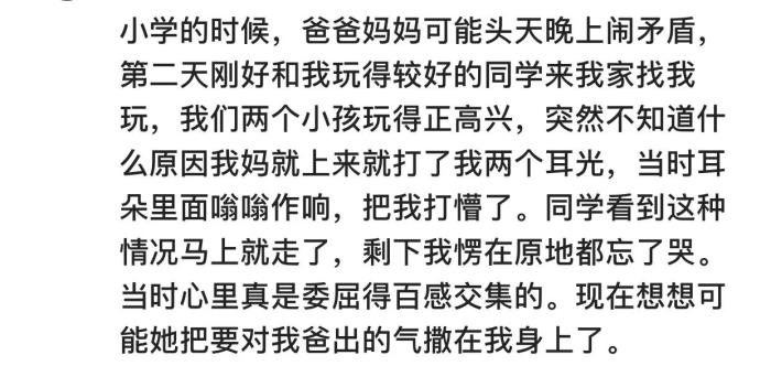 最委屈的事就是小时候我搬凳子给妈妈坐,她不知道然后往后退嗑到了脚,她二话不说扇了我一嘴巴,我到现在都记得,委屈的眼泪汪汪的
