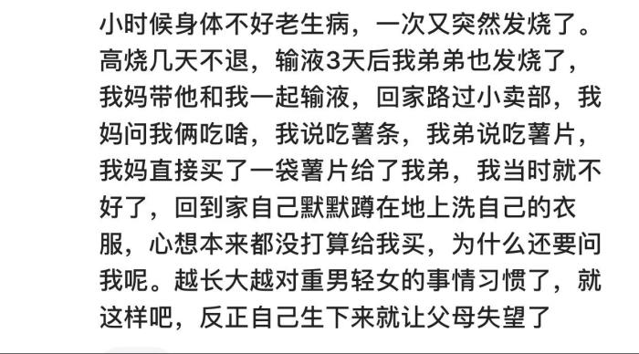 我家父母都特宝贝我弟,记得有次我弟不知道为啥哭,我在我卧室写作业,我爸妈跑去看我弟,我也跟着想去帮忙,我就在他们身后,我爸首先是非常厌恶仿佛很恶心般的等我一眼,我没说话,他接着就给我一巴掌还说为啥弄哭弟弟,我想解释,他又打我一巴掌让我滚。