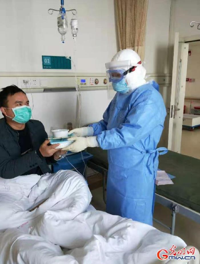新冠肺炎疫情比较特殊,就诊病人几乎没有家人陪同,所以在常规护理工作上还要承担病人的日常所需。比如帮助他们打水,给病人发饭。不能自主进食的病人,我们需要给他们喂饭,行动不便的卧床病人,我们要帮助处理大小便。为了减少交叉感染,病区内每天要进行三次消毒。病区25个房间,一个人背着几公斤重的喷雾器,消毒一次需要2个小时的时间。