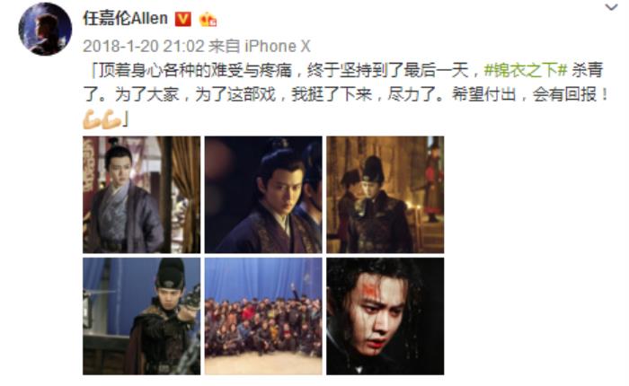 早在2018年的1月底,《锦衣之下》就正式完成了杀青,在新剧杀青之际,男主角任嘉伦就曾公开发文表示“顶着身心各种的难受与疼痛,终于坚持到了最后一天,《锦衣之下》杀青了。为了大家,为了这部戏,我挺了下来,尽力了。希望付出,会有回报”。