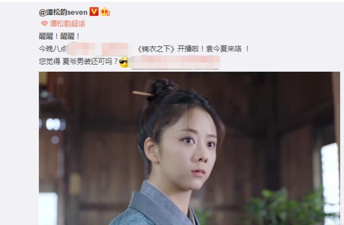 接下来就是女主角谭松韵,谭松韵在个人社交平台上面发文表示“《锦衣之下》开播啦!袁今夏来咯 !您觉得夏爷男装还可吗?”,确实如谭松韵所言,谭松韵在剧中饰演的袁今夏,就是一个“假小子”,女扮男装对于谭松韵而言,几乎于本色出演,毕竟谭松韵的性格一直都很“女汉子”。