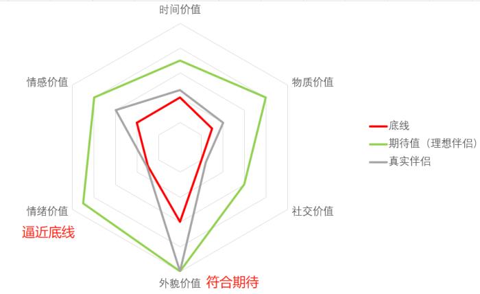 能够满足一个人所有期待指标的伴侣,我们称之为理想伴侣(绿色线),但真实情况是大部分人是无法遇到理想伴侣(绿色线)的,所以,我们匹配的是现实伴侣(灰色线)。