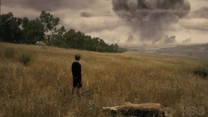 在预告中,有一个画面是一位小孩,看向远方的城市,但城市已经被炸成一片废墟,如同原子弹的蘑菇云升上天空。