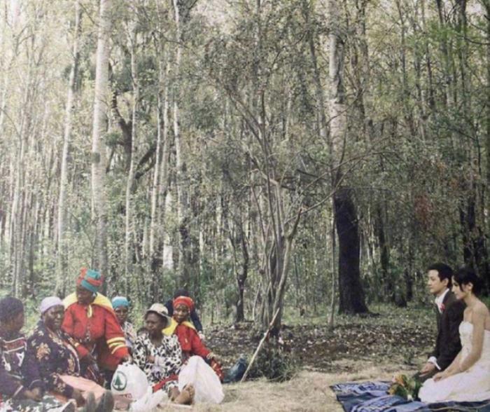 从吴彦祖分享的照片,可以看到俩人的婚礼仪式明显不同于别人的,他俩的婚礼是在一个丛林里举行的,到场的也不是亲友,而是一些外国友人,显得很是与众不同。与此同时,照片右下角吴彦祖妻子穿着抹胸婚纱礼服,露出香肩,可以看得出来她身材和外貌都是很不错的。