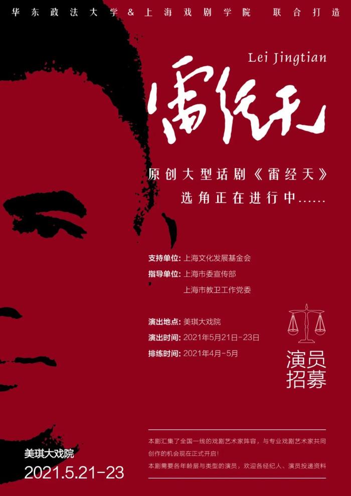 有意者请将简历发至邮箱:ecuplxcb@163.com,包括且不限于文字简历、照片、作品剧照、小视频等。邮件主题请注明“话剧《雷经天》演员招募”。