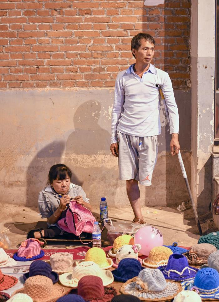为了多挣点钱,刘凤灵早上起来就开始直播,白天则做些手工艺品。天气好的时候,每天下午四点多,丈夫都会骑着三轮车带着刘凤灵去离家不远的夜市摆摊。