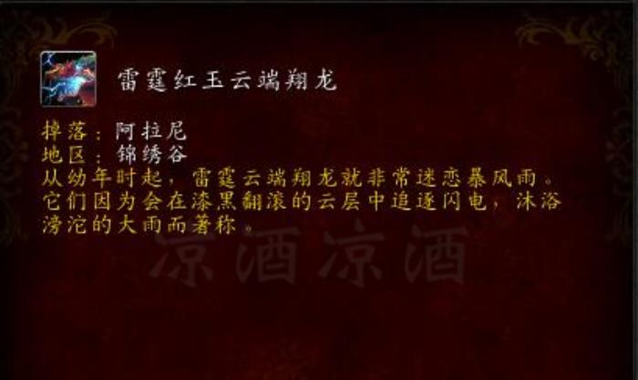 雷霆红玉云端翔龙,就是锦绣谷的阿拉尼掉落的坐骑: