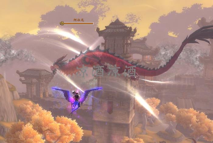 在锦绣谷可以看到天上飞着一条叫阿拉尼的红玉雷霆龙,身边云雾笼罩: