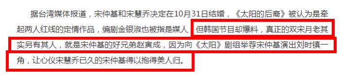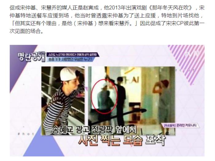 知情人士还爆料,《太阳的后裔》男主角人选原是赵寅成,但赵寅成婉拒戏约,并推荐了宋仲基出演男主角一职,才因此牵起了宋仲基、宋慧乔的缘分,宋仲基追星之路终于在2015年实现,直到2016年成功将女神追到手里。