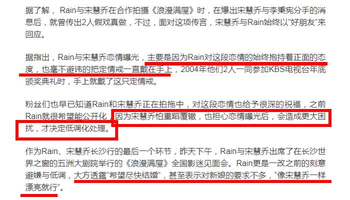 宋慧乔几次前往美国短期游学的时候,Rain刚好也到美国接受声乐训练,所以两人在国外甜蜜约会的消息在网上疯传。