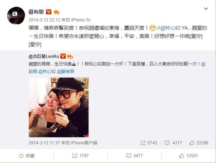 2014年,苏有朋转发了林心如和古巨基的微博,四人自称是“情森森”帮,约定了下次要“好好的聚一次”。