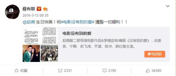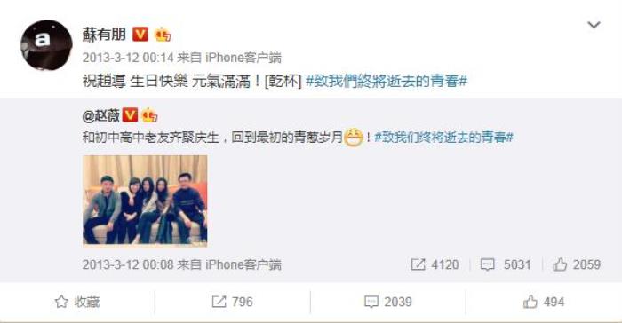 2013年他转发赵薇的微博,还不忘带话题帮她宣传电影《致我们终将逝去的青春》。