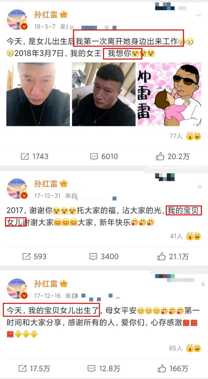 2017年,王骏迪为孙红雷产下一女,孙红雷第一时间在社交平台上公布了这一喜讯。几个月后,孙红雷还因为是女儿出生后第一次离开她工作,发了条动态表示不舍和想念,字词间都是对女儿浓浓的爱意。