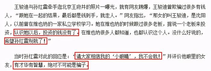 孙红雷和王骏迪刚在一起时,大众对王骏迪各方面都进行了深挖。不知从那里听来的传闻说王骏迪私生活并不检点,会把孙红雷的钱骗光走人。对此,孙红雷也霸气护妻,表示:“请大家相信我的‘小眼睛’,我不会栽!”言语之间对当时的女友、现在的妻子多有维护。