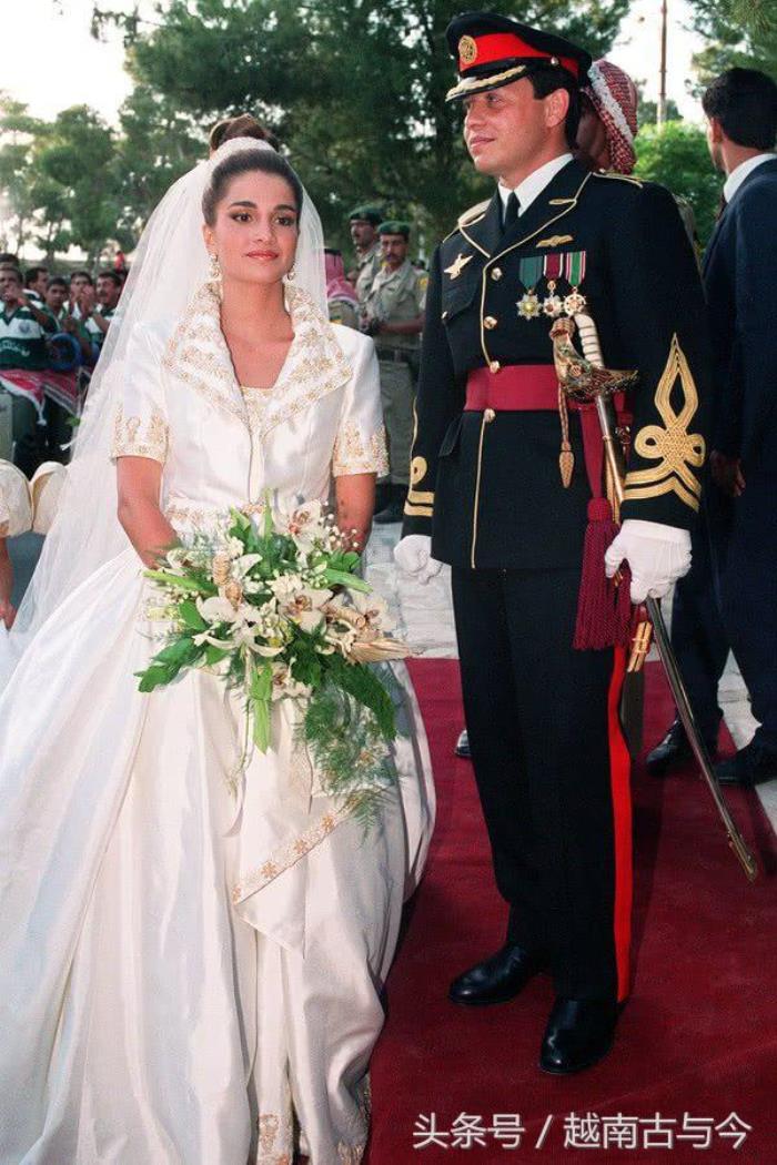 被称为约旦最美王后的拉尼娅王后当年结婚婚纱也是特别美,1993拉尼娅王后大婚,当时她穿的婚纱是简洁的设计,设计了别致的领口十分迷人,她昂贵的钻石铂金皇冠使她散发着优雅气质。