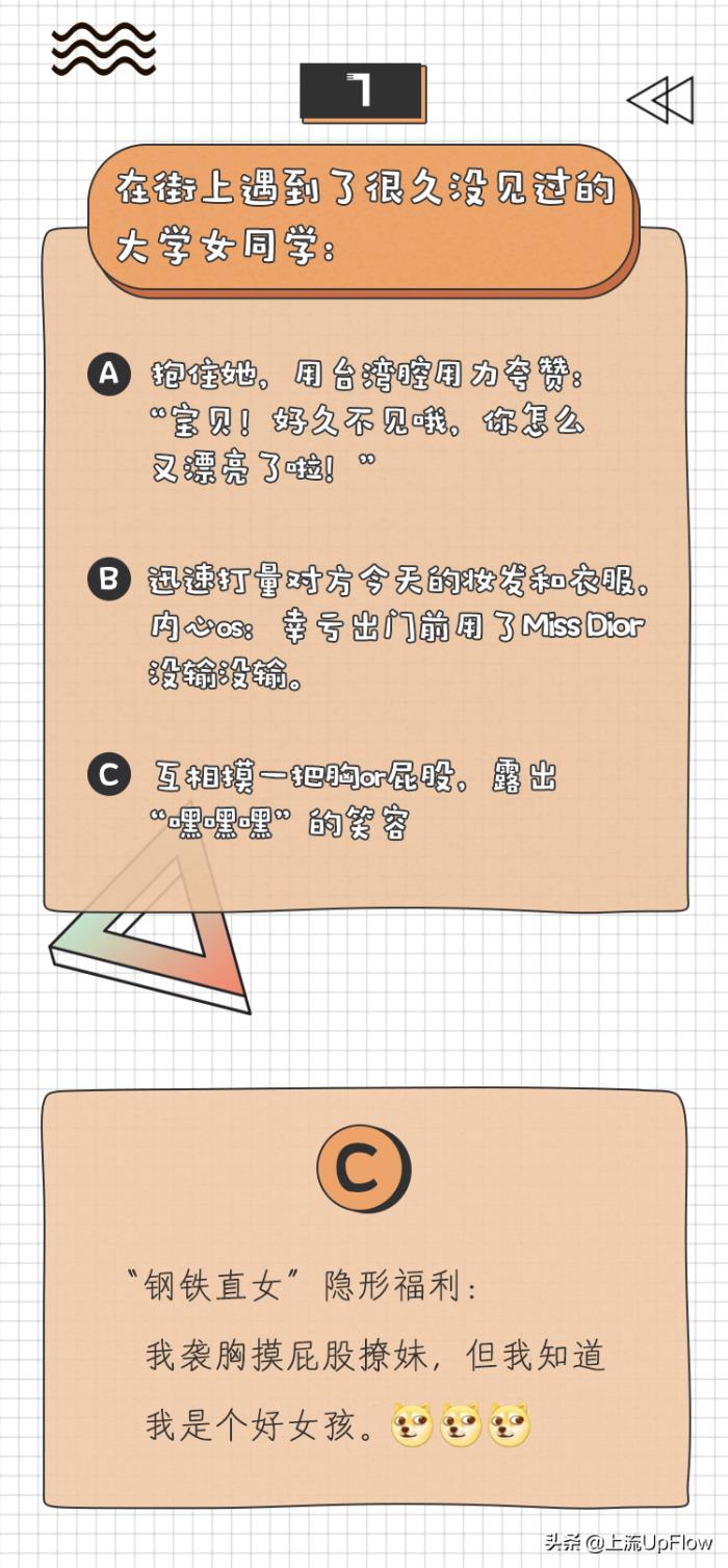 她们很少花大量时间挑衣服,佛系穿搭,哪件干了穿哪件;从不撒娇卖萌,更喜欢有什么说什么,公事公办;没有弯弯绕绕的小心思,日常最多的就是哈哈哈哈哈哈哈;神经大条,很难get到含蓄的小暧昧与小浪漫。当男生以为“她不回应我,是因为对我没感觉”时,其实……她们是真没懂