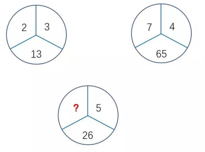 经典的扇形数字题。三个圆的规则一样,从上边两个圆里找规律,再给下边的圆填上合适的数字。