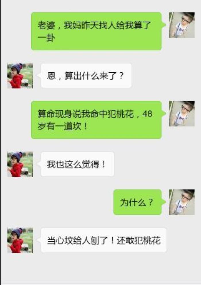 老公故弄玄虚,说昨天他妈找人给他算了一卦。女人自然肯定会问算出什么结果来了。哪知老公说出“命中犯桃花,48岁还有一道坎。”听到这话女人气不大一处来。“当心坟给人刨了”你要是敢犯桃花的话!