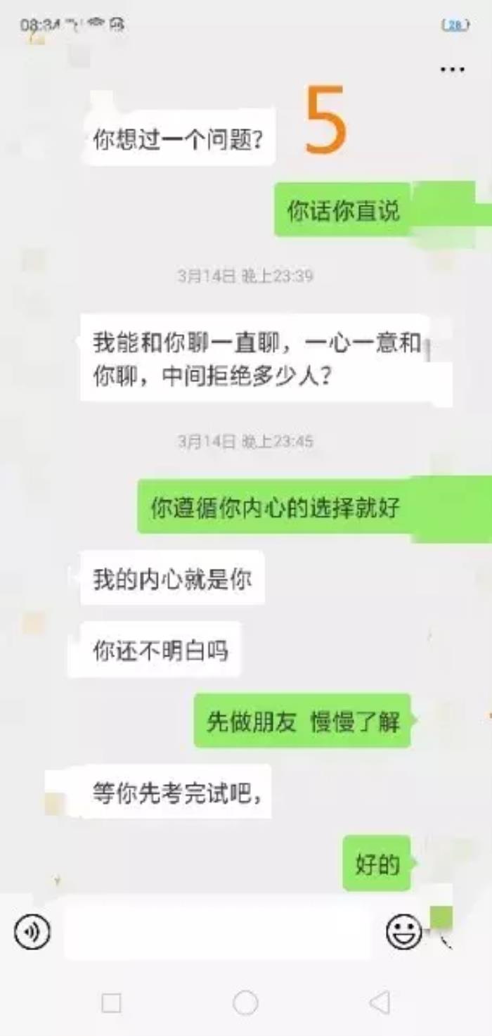 这就是一个接招。你现在没有接招的意识,你们两人就没有办法通过约会往下互相了解、继续推进,你们只是在网上聊,也聊不出什么结果。