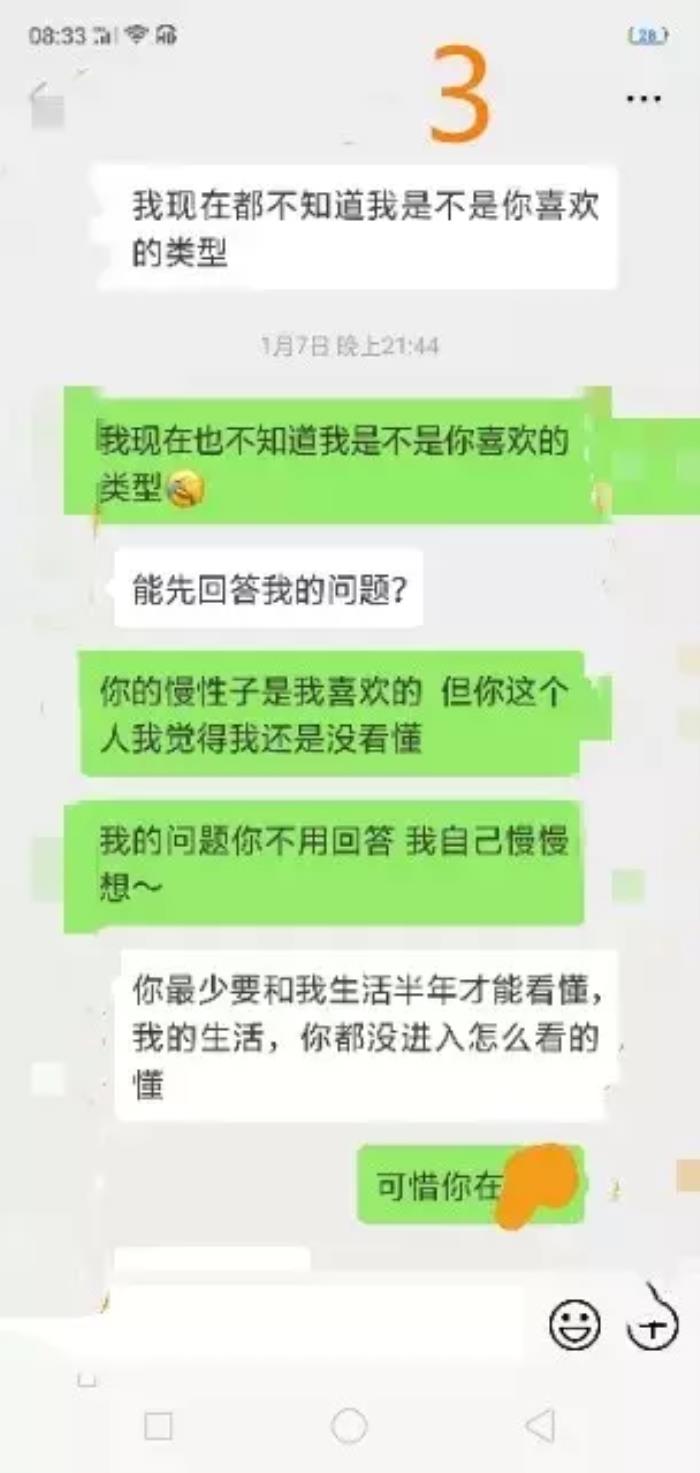 认识有三个月了,一般微信偶尔电话,由于种种原因只见面四次。我属于比较被动的人,不会主动找他,有时候回微信比较慢,遇到问题喜欢冷处理。