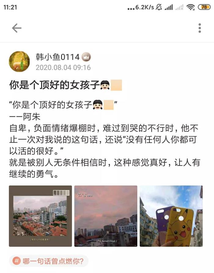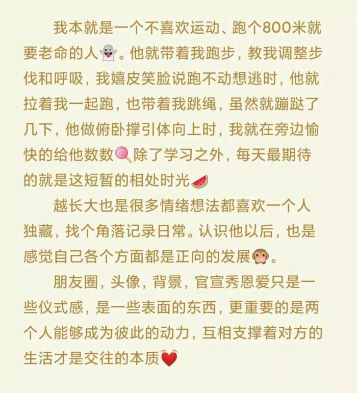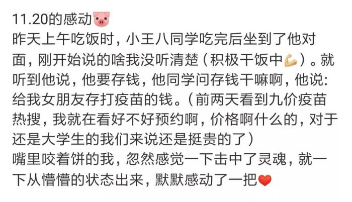 我还记得在自习室下雨了,我们俩都没伞,他把衣服脱了给我穿上,给我送到宿舍自己又跑回宿舍。虽然这看起来是电视剧里很老套的剧情了,但是发生在自己身上还是觉得暖暖的。