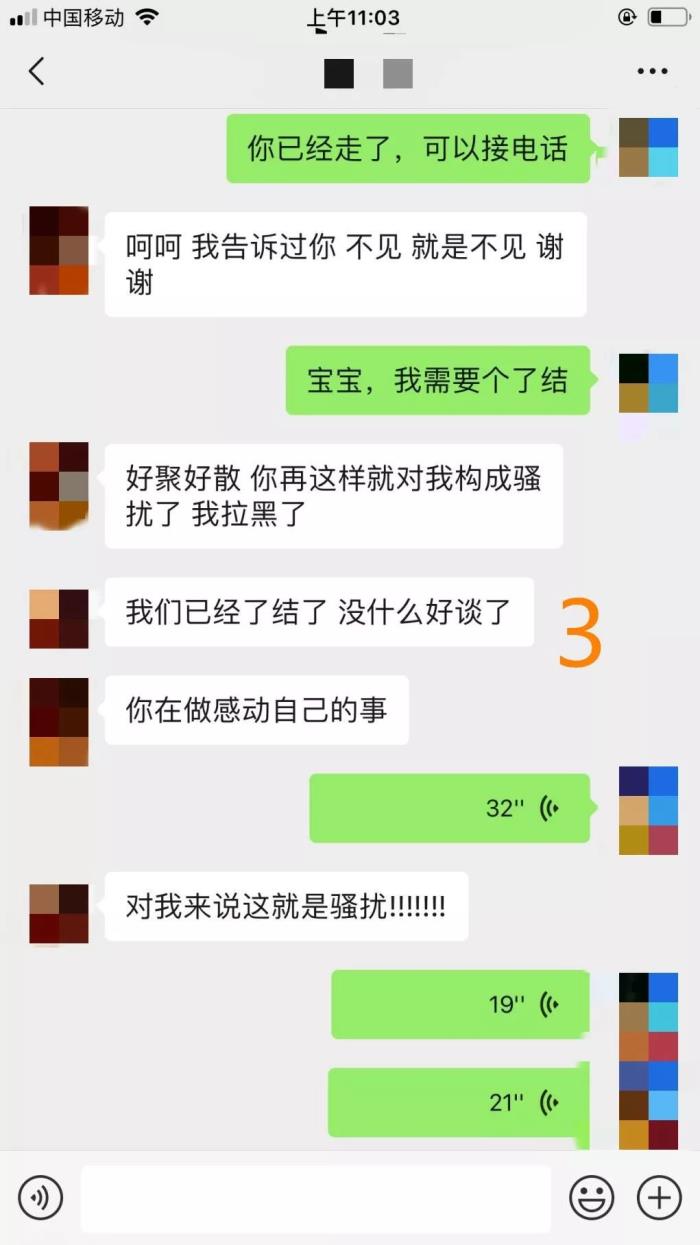 你说什么“希望她能够再给一次机会把心结打开”,人家在聊天记录里面讲得很清楚了,你这样对她已经是一种骚扰了,你懂吗?你知道什么叫骚扰吗?