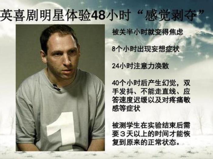 实验结果表明,在被剥夺感觉后,人们会产生难以忍受的痛苦,各种心理功能会受到不同程度的损伤。所以说,丰富多变的环境刺激是我们生存的必要条件,我们的身心要想保持在正常的状态,就需要不断地从外界接受刺激。