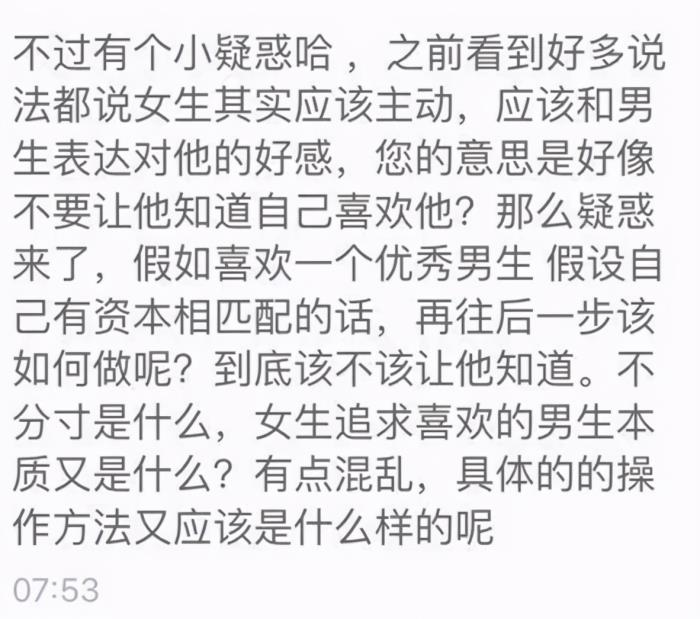 不过有个小疑惑哈 ,之前看到好多说法都说女生其实应该主动,应该和男生表达对他的好感,您的意思是好像不要让他知道自己喜欢他?那么疑惑来了,假如喜欢一个优秀男生,假设自己有资本相匹配的话,再往后一步该如何做呢?到底该不该让他知道。不分寸是什么,女生追求喜欢的男生本质又是什么?有点混乱,具体的的操作方法又应该是什么样的呢