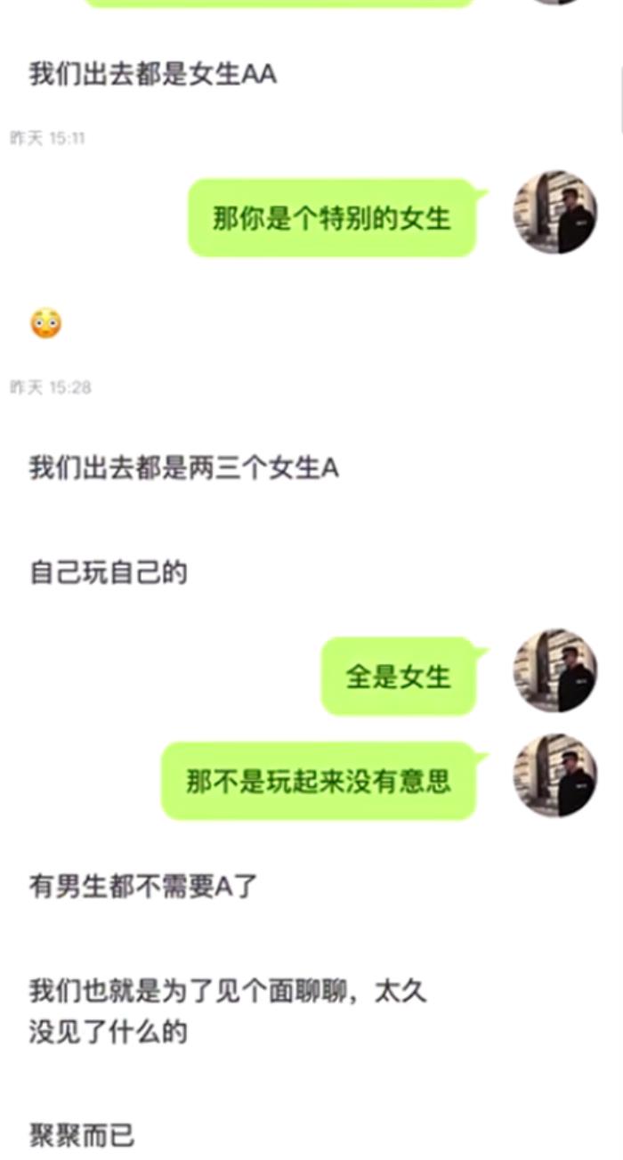 女生说她们去喝酒都是跟姐妹去AA的,恰好我在跟学员做聊天复盘,就问深圳学员这里你们应该如何去回复。