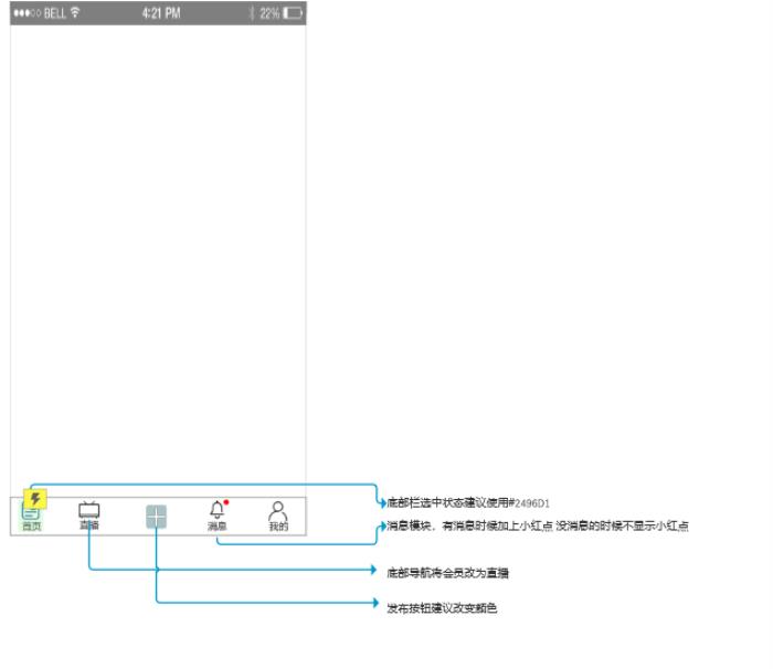 改变颜色,这个功能知乎老大们应该考虑到发布按钮的颜色,所以在其他每个选中的菜单按钮交互颜色为灰色,只是个人认为选中的时候还是选择知乎颜色,发布按钮可以另取颜色。直播和会员的位置调换位置。当有消息时,菜单消息按钮有红色的小点。