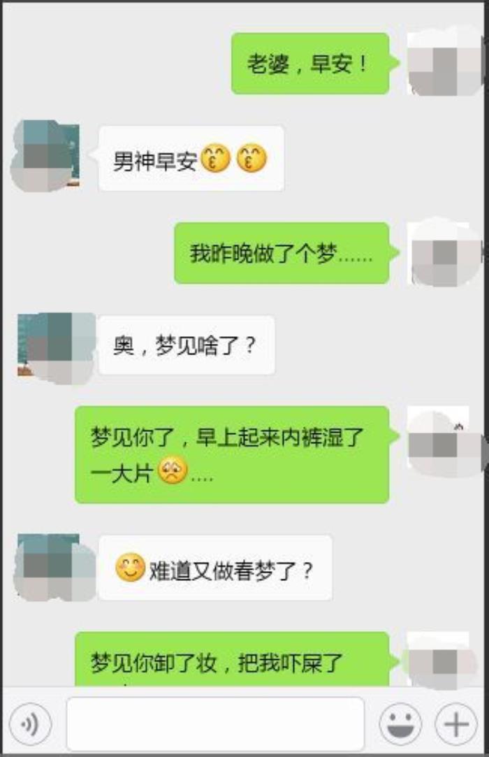 这段出其不意的对话真是让人始料未及。男神昨晚做了一个梦,还说内裤湿了一大片,而作为小迷妹的她免不了暗自窃喜一番。“难道是做春梦了?”男神则是回复“梦见你卸了妆,把我吓屎了”。哈哈,这真是让人笑喷,这对情侣简直太逗趣了!