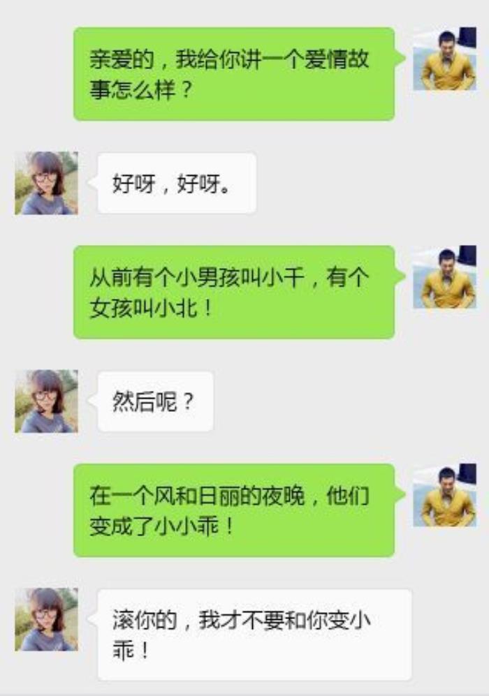 这对情侣里面的男人一看就是“老司机”了。说话一套一套的,稍不留神就被套进去了。以讲爱情故事为幌子,实则打着是干坏事的心啊!真的是让人防不胜防。“从前有个小男孩叫小千,有个女孩叫小北”,“在一个风和日丽的夜晚,他们变成了小小乖!”