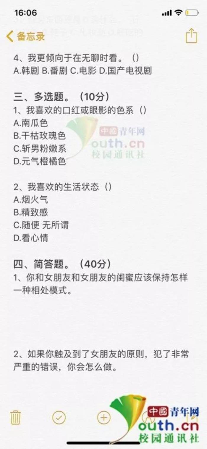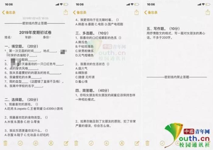近日,南京工业大学男生王泽(化名)收到了一份女友出的“期末恋爱试卷”。