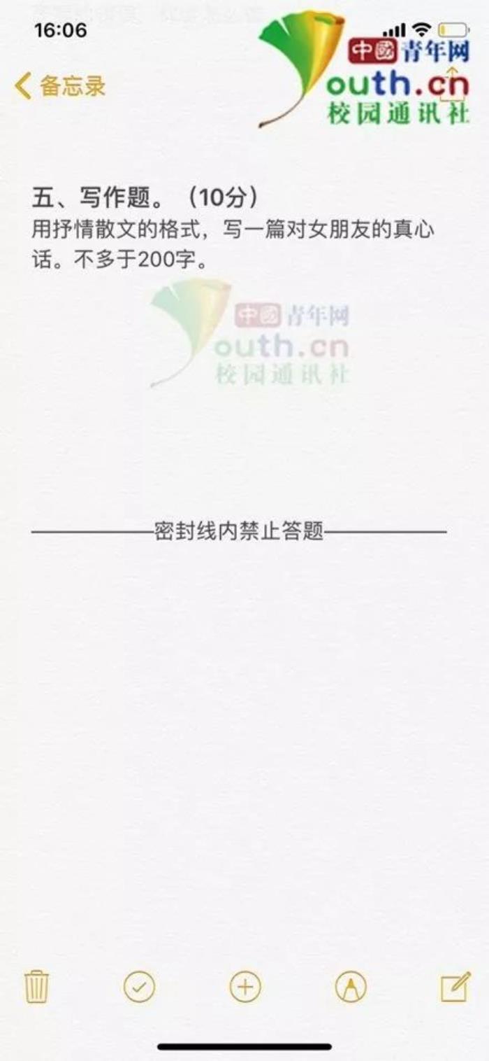 记者看到,这套试卷共分为五个大题,分别为填空题、选择题、多选题、简答题、写作题。填空题多为“我的穿衣风格?”“我最爱吃的水果?”“我高中学校的名字?”等,还有一道填写血型的题目,后面标注“这道题答错了不及格”。最后的写作题内容为:用抒情散文的格式,写一篇对女朋友的真心话,不多于200字。