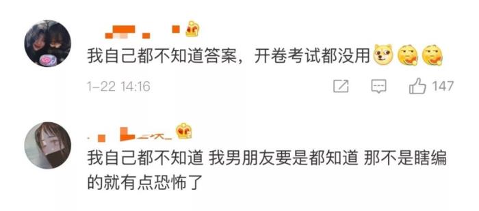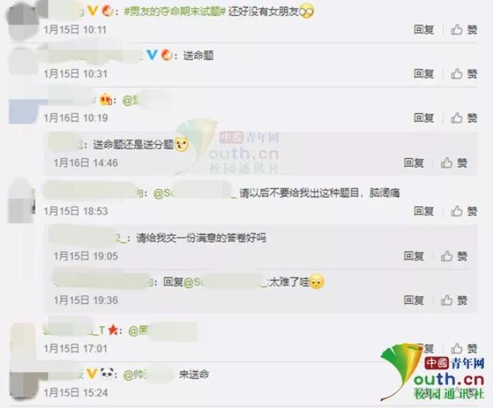 该试卷在网络发布后,引来网友评论。有网友疑惑这是“送命题还是送分题”。有网友表示很服气,有网友@自己的男女朋友,并留言说,“请给我交一份满意的答卷好吗?”还有网友直接@男女朋友后,评论说:“进来做试卷。”“进来答题。”